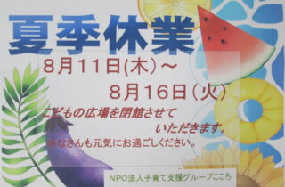 8月11日(木)~8月16日(火) お盆休みのため、こどもの広場を閉館させていただきます。 みなさんも元気にお過ごしください。