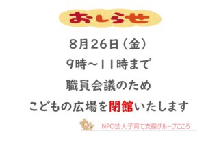 明日(8/26)こどもの広場を閉館させていただきます。 ご迷惑をおかけします。