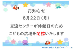 日頃よりご利用いただきありがとうございます。 8/22(月)交流センターがメンテナンスの為、閉館になります。 それに伴い、こどもの広場も閉所と致します。 ご迷惑をおかけします。