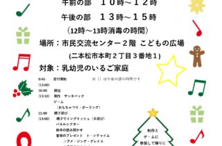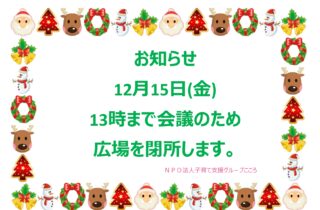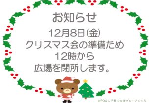 冷たい風で体は冷えますが、クリスマスの飾り付けを見るだけで体が自然と暖かくなるような気がします。 広場では12/9(土)クリスマス㏌ひろばを開催いたします。 ぜひ、制作・ゲ-ムに参加してください。 プレゼントももらってね […]