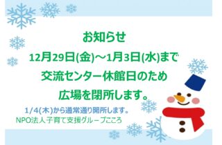 2023年も残りわずかとなりました。 今年も大変お世話になりました。 今年は新型コロナウイルス感染症が「5類感染症」に移行し、元の生活に戻りつつあります。 こころでは、ファミリサポート養成講座も行い、新しい仲間も増や […]