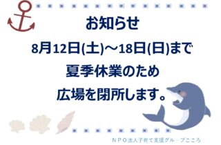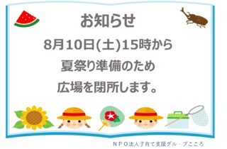 明日、8/10㈯は夏祭り準備のため、15時でこどもの広場を閉所致します。 ご迷惑おかけしますm(__)m