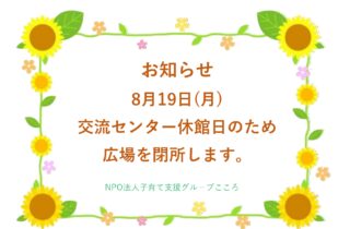 日頃よりご利用いただきありがとうございます。 8/19(月)交流センターがメンテナンスの為、閉館になります。 それに伴い、こどもの広場も閉所と致します。 ご迷惑をおかけします。