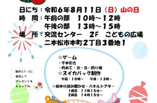 8/11㈰に夏祭りを開催します。 乳幼児のお子さんがいるご家庭の方が参加できます。 午前は10時〜12時 午後は13時から15時までとなっています。 ゲ-ムや制作に参加して商品をゲットしましょう。 交流センターでも夏祭り […]